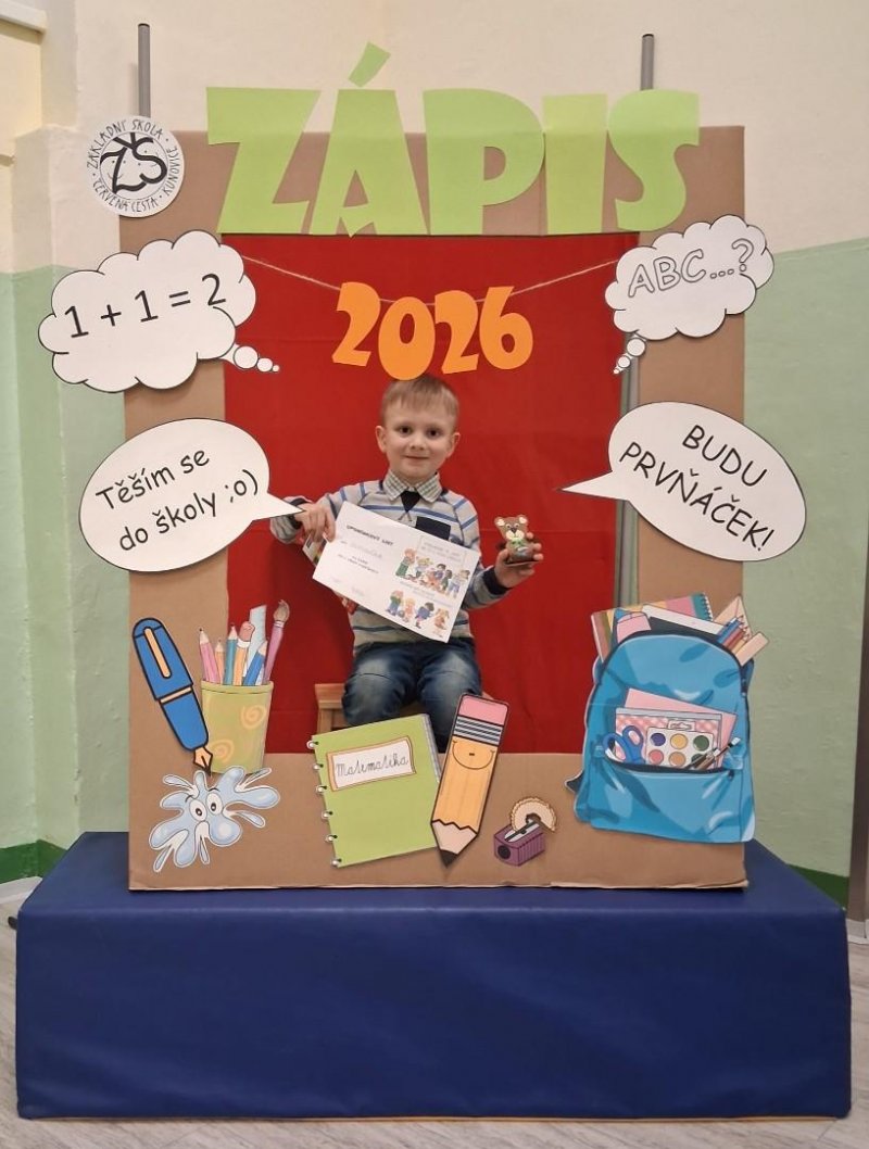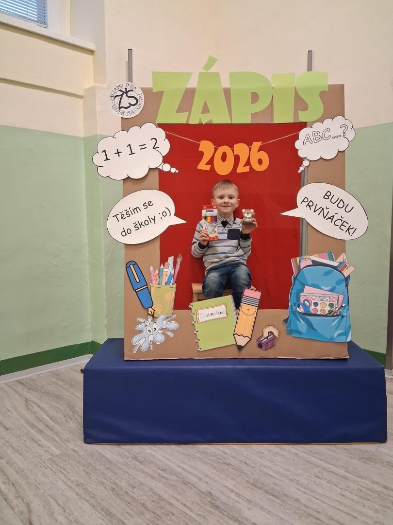 I v naší škole proběhl 6. února zápis do 1. třídy. Současná první třída se proměnila na toto odpoledne v pohádkovou místnost s různými pohádkovými postavami, u kterých budoucí prvňáčci plnili různé úkoly. Všem se moc dařilo. A možná i díky tomu, že v pohádkách většinou fotoaparáty nejsou, jsme zapomněli fotit a máme jen jedinou fotografii. Naštěstí si děti udělaly své fotografie v našem fotokoutku.