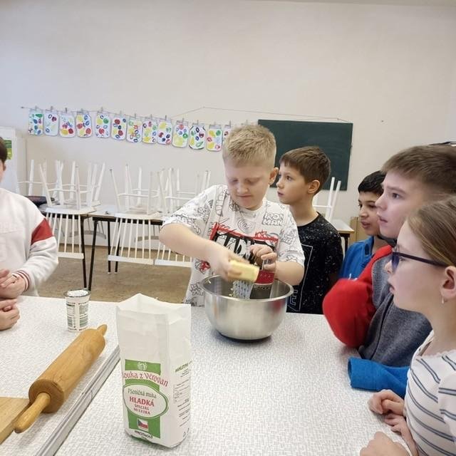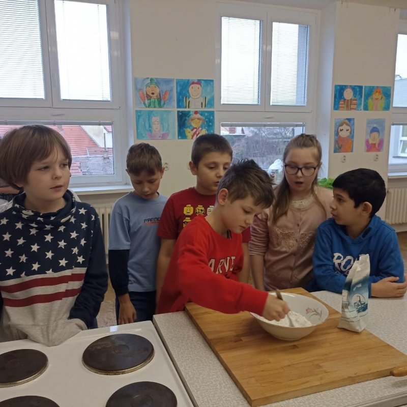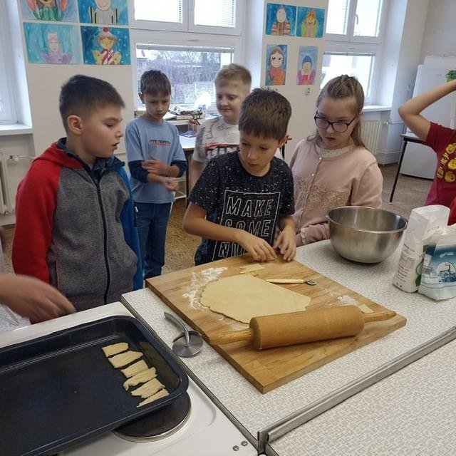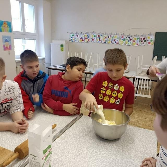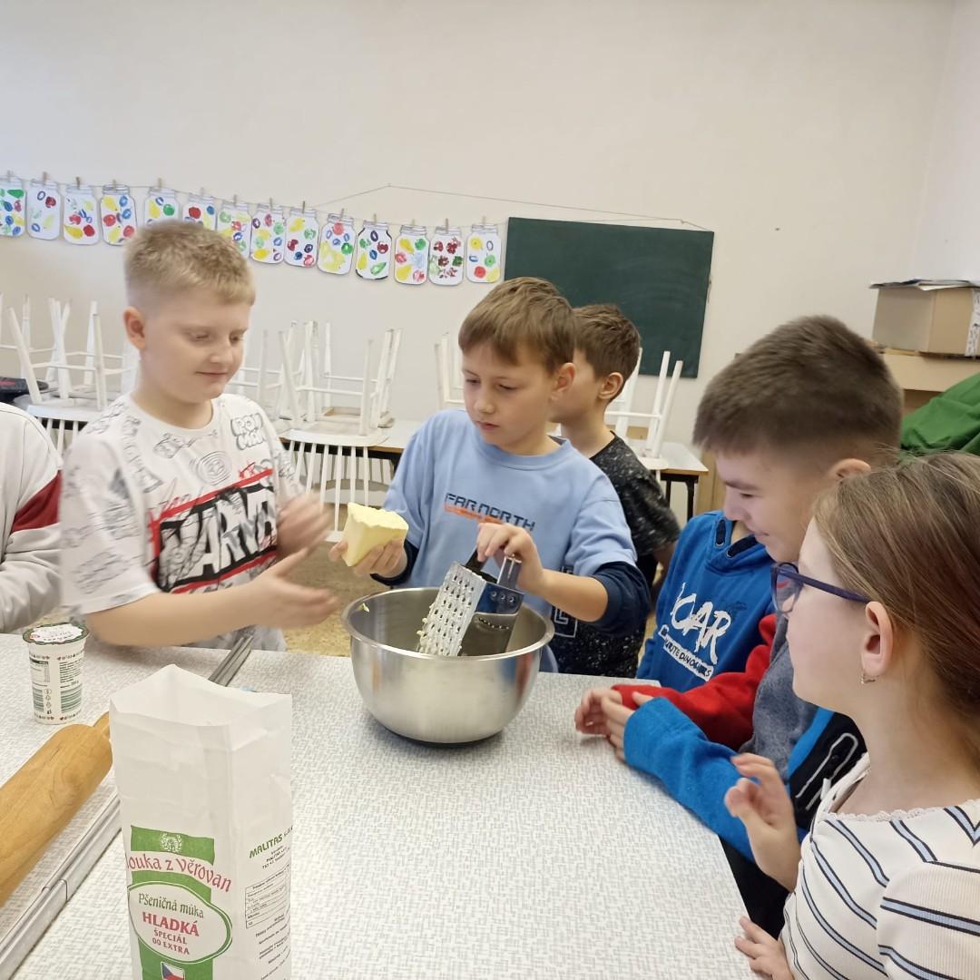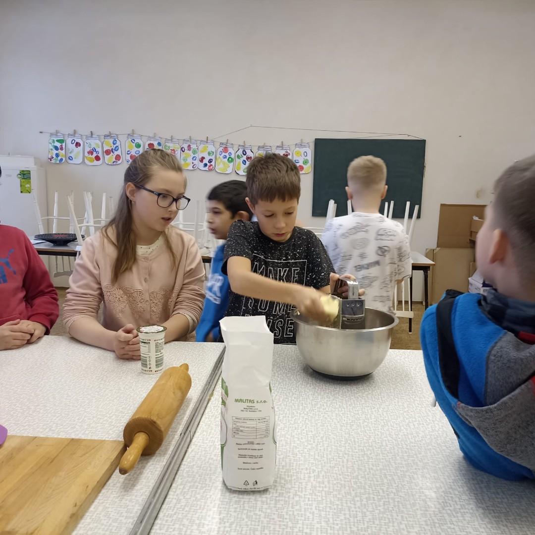 Den před pololetními prázdninami a před rozdáváním výpisu z vysvědčení jsme se domluvili, že si upečeme ve školní kuchyňce něco sladkého. Protože jsme přiložili všichni ruku k dílu, chutnalo nám. Pak už jsme se radovali z dobrých známek na vysvědčení