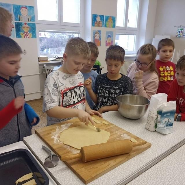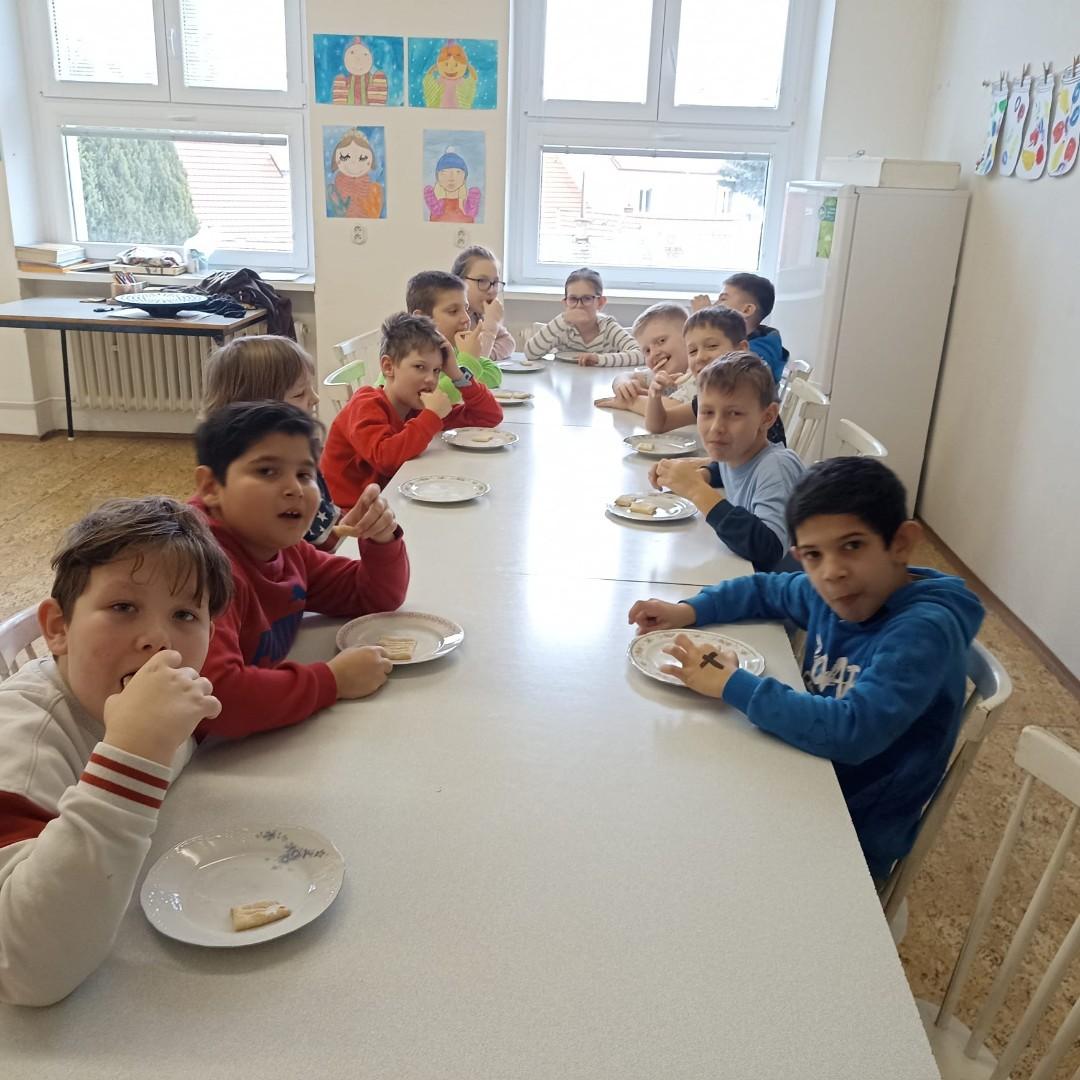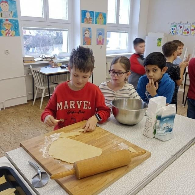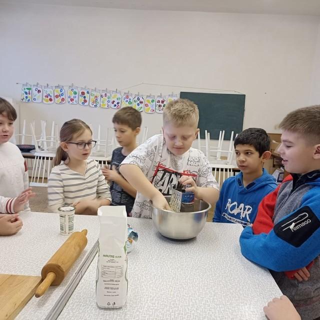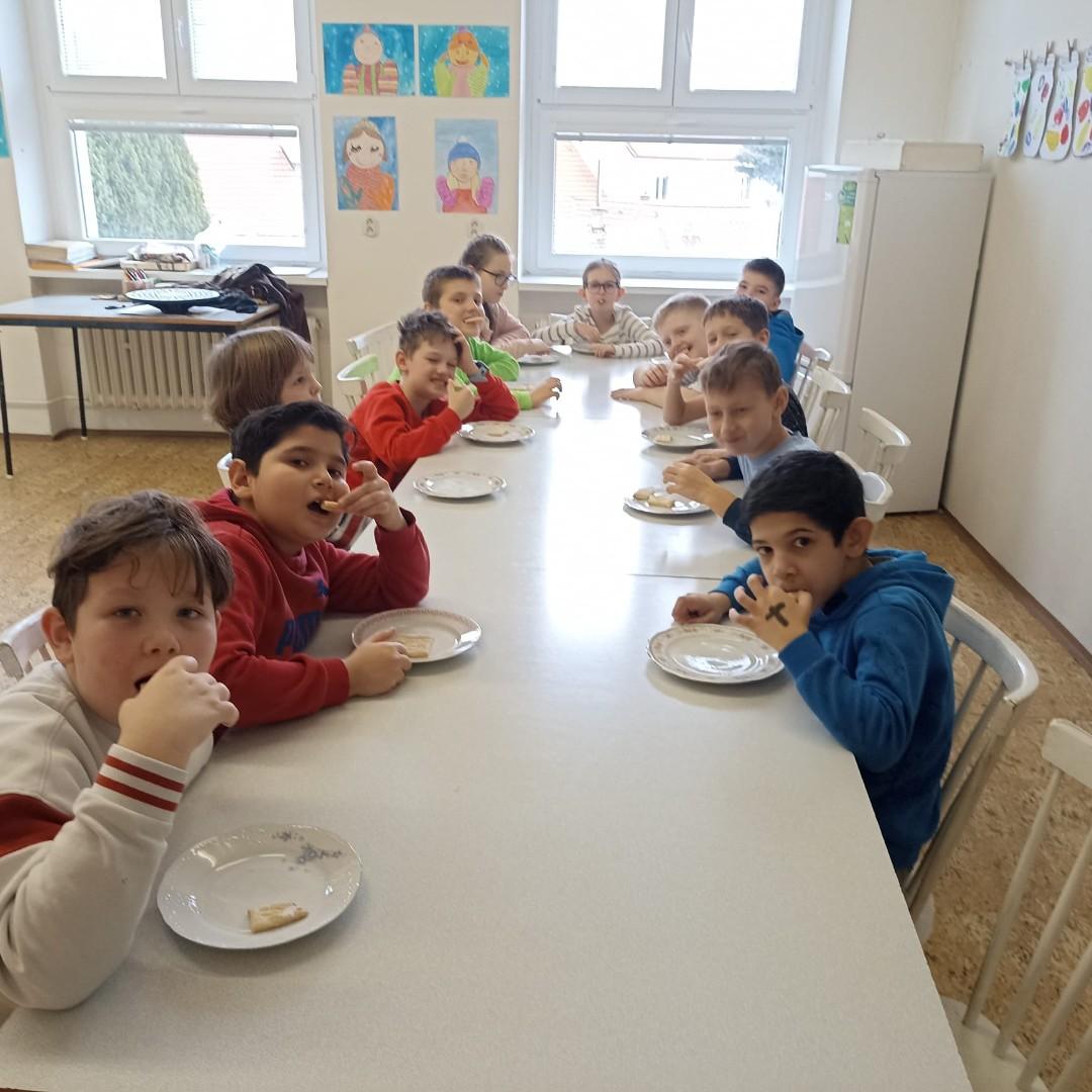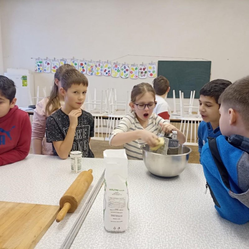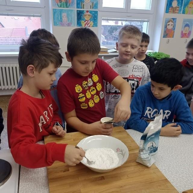 Den před pololetními prázdninami a před rozdáváním výpisu z vysvědčení jsme se domluvili, že si upečeme ve školní kuchyňce něco sladkého. Protože jsme přiložili všichni ruku k dílu, chutnalo nám. Pak už jsme se radovali z dobrých známek na vysvědčení
