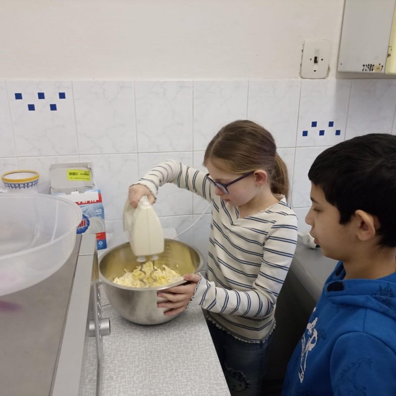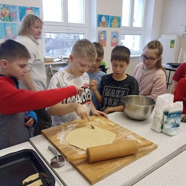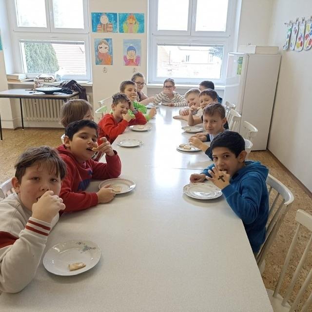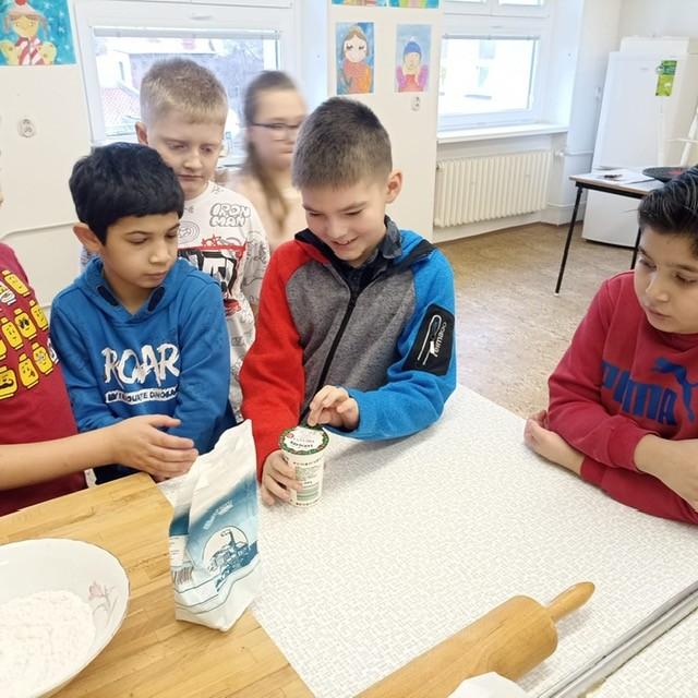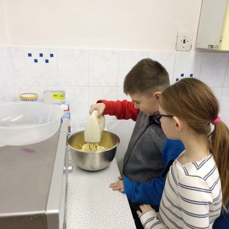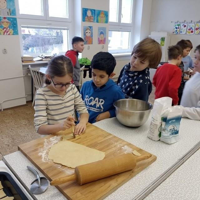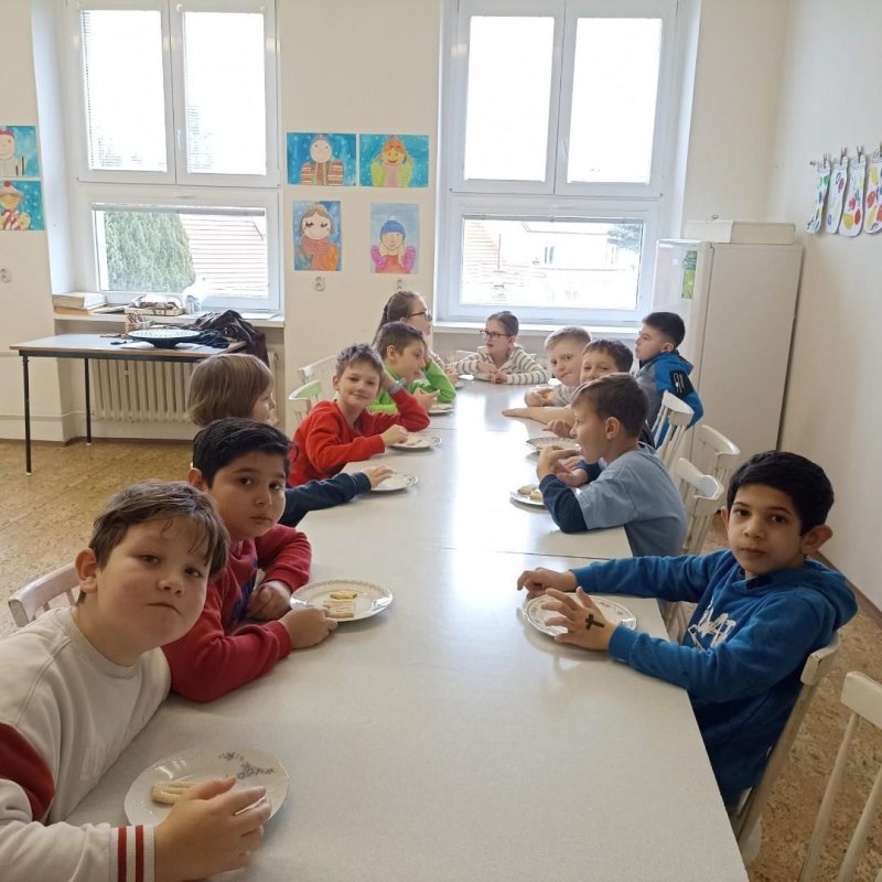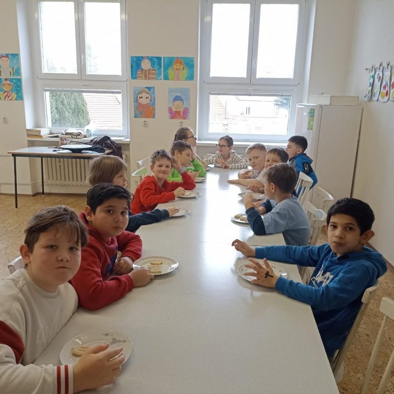 Den před pololetními prázdninami a před rozdáváním výpisu z vysvědčení jsme se domluvili, že si upečeme ve školní kuchyňce něco sladkého. Protože jsme přiložili všichni ruku k dílu, chutnalo nám. Pak už jsme se radovali z dobrých známek na vysvědčení